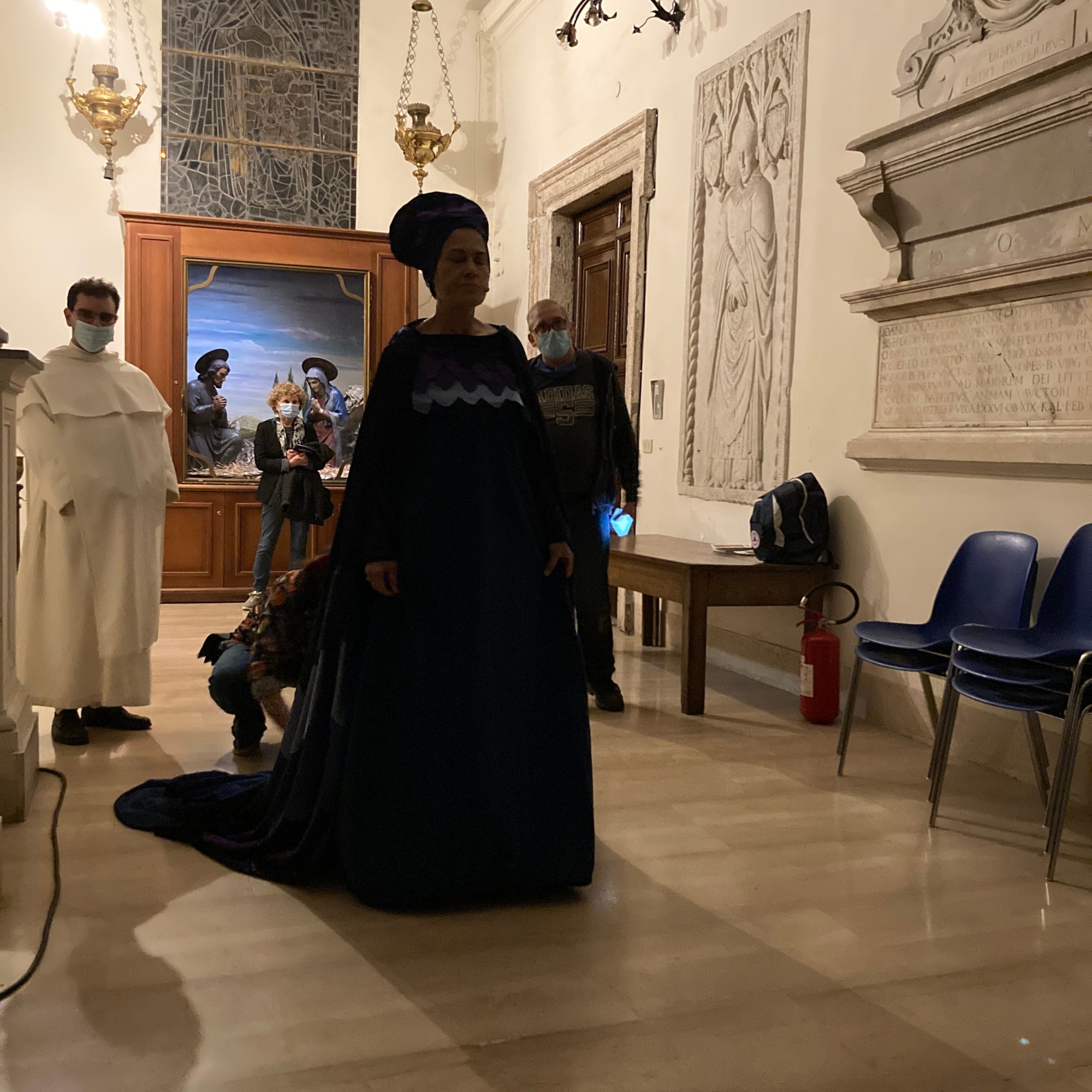Sono stati qui, avanti e indietro fra il chiostro e la sacrestia. Portando in giro abiti, cavi, pedane, luci, mixer e tanto altro ancora.