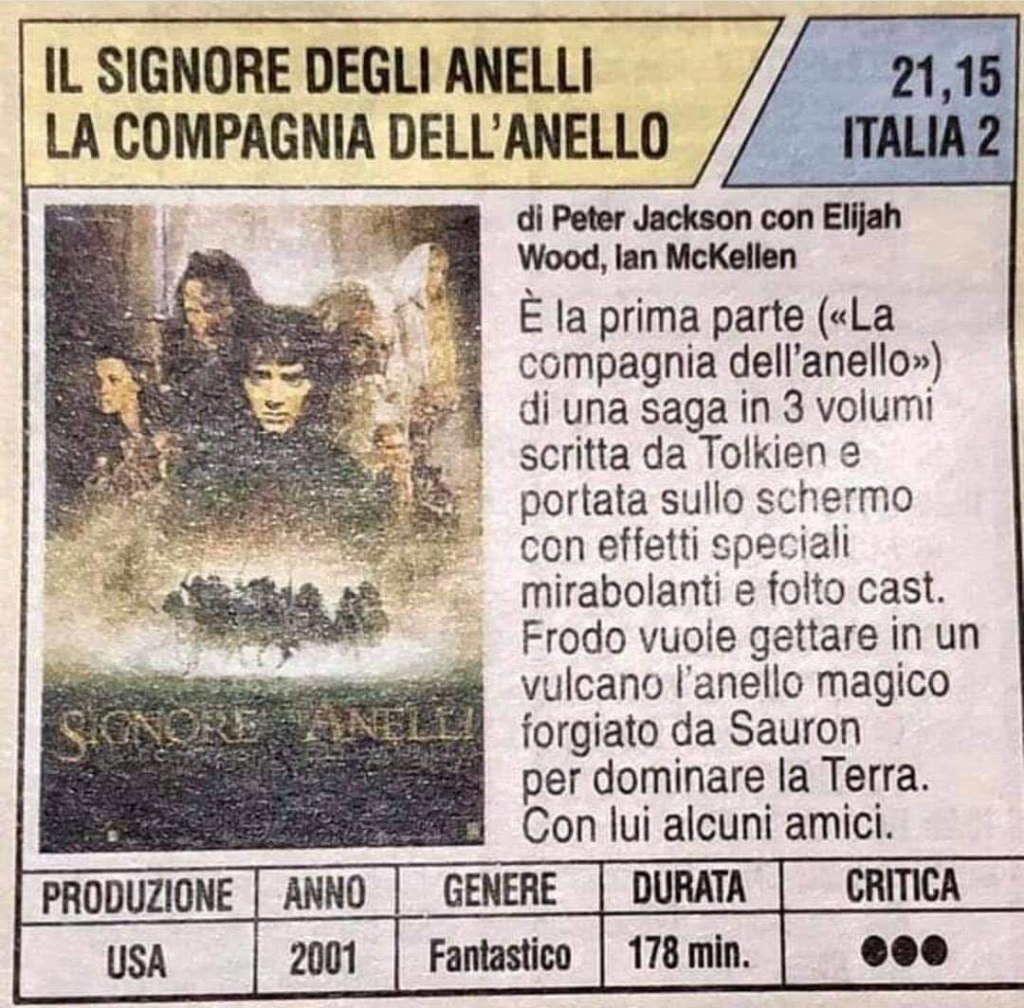 “Frodo vuole gettare in un vulcano l’anello magico forgiato da Sauron per dominare la Terra. Con lui alcuni amici”.