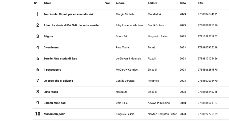 Nuovo libro dell’autrice più venduta nel 2022, è Stigma di Erin Doom, edito da Mondadori. Un libro scritto molto bene. Erin Doom, dopo il successo dei precedenti libri (tra cui ricordiamo Il fabbricante di lacrime), ci regala una storia che vede come protagonista Mireya, una ragazza che decide di ricominciare a Philadelphia. Da qui, inizia la sua vita come barista al Milagro’s. Questo lavoro cambierà la sua vita e quella del capo della sicurezza, Andras. Un romanzo che avvince sin dalla prima riga e che conquista il lettore. La scrittrice, che ha palesato da poco tempo il suo viso e la sua identità, regala un libro con un finale che resta appeso. Forse ci sarà un seguito? Da leggere! Voto 4 su 5