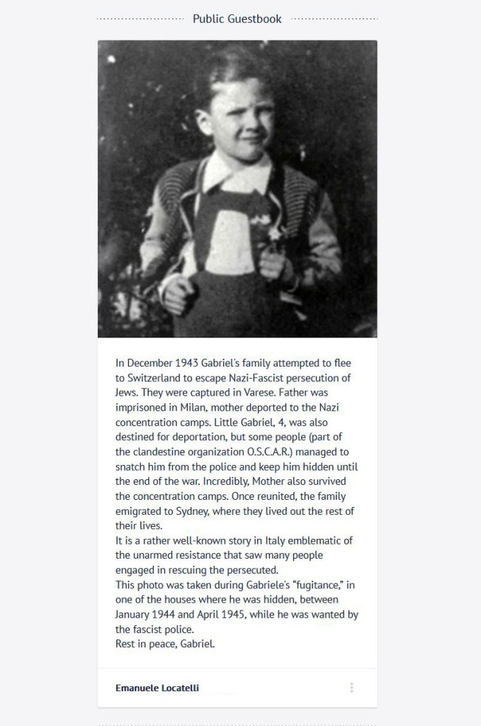 [10] L’ultimo contatto si segnala attorno al 2011, per un lavoro che poi non andò in porto, sempre sulla memoria di quegli eventi: chi ci ha parlato, ha detto che ha risposto alla moglie e che non gli avrebbe passato Gabriele. Il fatto che siano andati dall’altra parte del pianeta è abbastanza per provare a immaginare che cosa possano avere provato non solo Gabriele e la sua famiglia, ma tutte le vittime di ingiuste persecuzioni, nella storia.